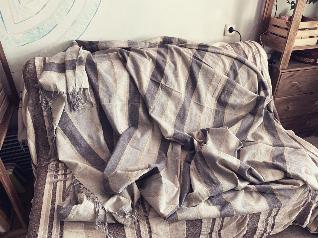А покрывало я увидела в магазине и поняла, что никуда без него не уйду. Оно подошло по всем параметрам, начиная от материала и заканчивая цветовой палитрой. К тому же, это покрывало пришло в мой дом на замену сразу двум другим, которые как раз выбивались из обозначенной мной цветовой гаммы.